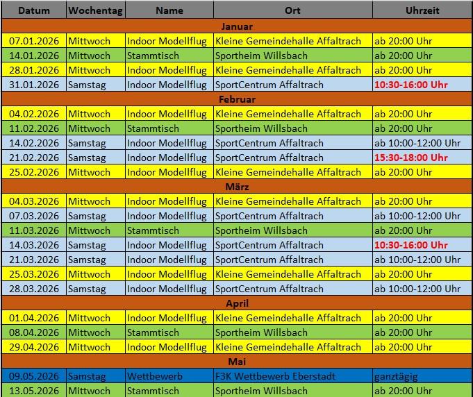 Indoor Flugzeiten für die Saison 2025-26 Flugbetrieb in folgenden Hallen / Adressen / Änderungen vorbehalten Gemeindehalle Affaltrach SportCentrum Affaltrach TSV Sportheim